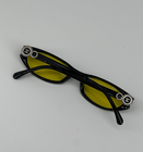 Silueta fina, lente amarilla y el icónico CC metálico tipo botón en la patilla, uno de los detalles más buscados de Chanel eyewear vintage. Un diseño que hoy vuelve con fuerza porque no parece retro: parece actual.