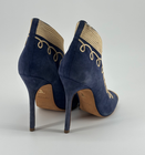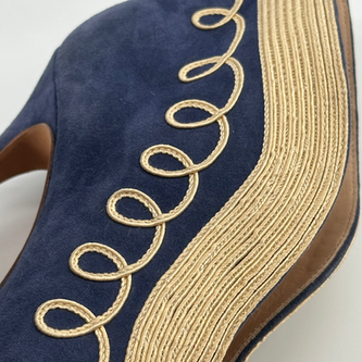 El contraste del ante azul marino con el bordado dorado en relieve recuerda al lujo teatral italiano: un poco ópera, un poco noche larga. No buscan ser básicos; buscan ser recordados.