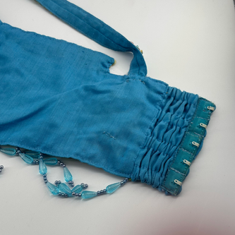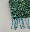 Muy finales 90s / Y2K temprano: silueta tipo sujetador estructurado, color verde iridiscente y flecos turquesa que se mueven al andar (o bailar).